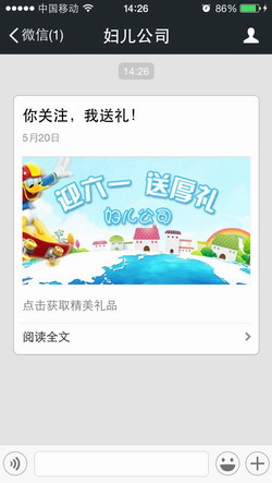 1、在微信里首次关注后,会返回一个图文消息,提示关注有礼,点击领取礼品。