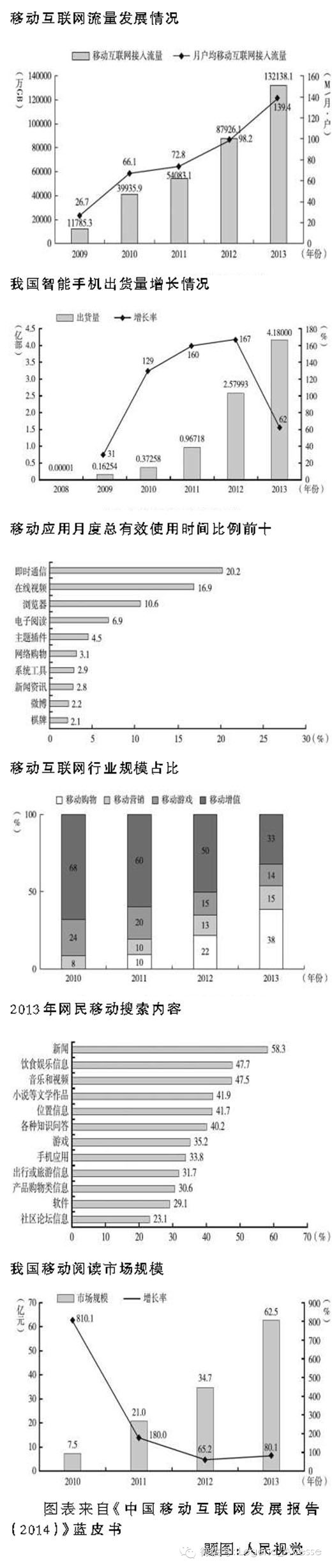 《中国移动互联网发展报告(2014)》蓝皮书相关内容 报告显示,截至2014年1月,我国移动互联网用户总数达8.38亿户,在移动电话用户中的渗透率达67.8%;手机网民规模达5亿,占总网民数的八成多,手机保持第一大上网终端地位。我国移动互联网发展进入全民时代。